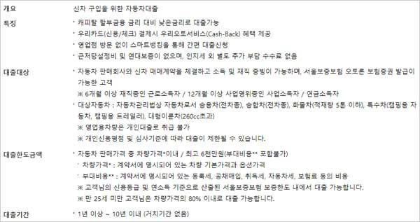 근저당설정비 및 연대보증이 없으며 인지세 외 별도 추가 부담 수수료가 없는 비대면 전용 자동차 대출 상품으로서, 캐피탈 할부금융 금리 대비 낮은금리로 대출이 가능하며, 우리카드(신용/체크) 결제시 우리오토서비스(Cash-Back) 혜택이 제공되는 특징이 있다고 해요.