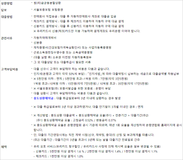 - 신용카드 결제방식 : 대출 후 신용카드를 이용하여 자동차 구매 대금을 결제하는데요. 다만 우리카드사 신용(체크)카드만 이용 가능하며 결제계좌도 우리은행이여야 한다고 해요.
