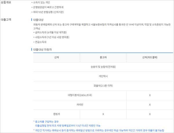 신한은행 자동차 대출 금리 조건 및 신청대상 자격 조건은 어떻게 될까요? 자동차 판매업체와 신차 구매계약을 체결하고 서울보증보험의 적격심사를 통과한 만 19세 이상이며, 직업 및 소득증빙이 가능한 분입니다. 대출 한도 금액은 연소득 범위내 최대 6천만원 이내라고 합니다.