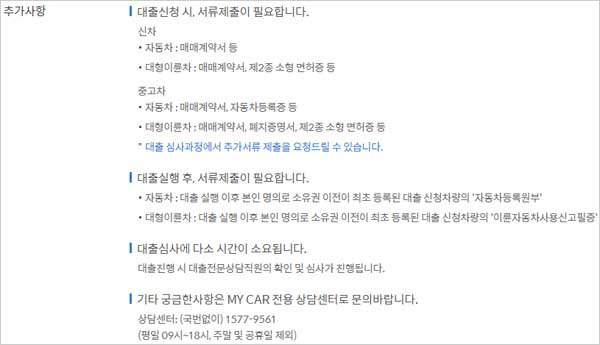 - 대출 실행 후 자동차 판매회사 또는 판매대리점의 계좌로 입금되며 반드시 본인명의로 대출 대상 차량의 소유권 이전이 완료되어야 합니다.