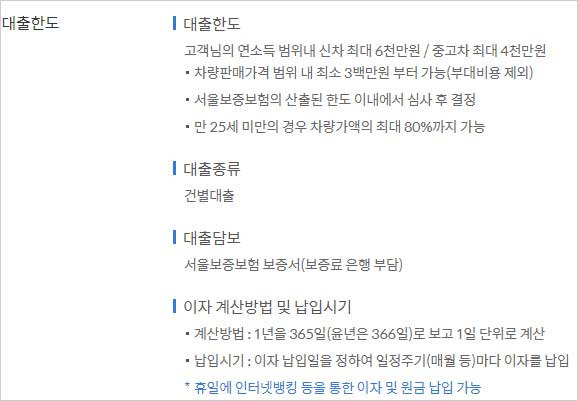 서울보증보험의 산출된 한도 이내에서 심사 후 결정하며 만 25세 미만의 경우에는 차량가액의 최대 80%까지 대출이 가능합니다.