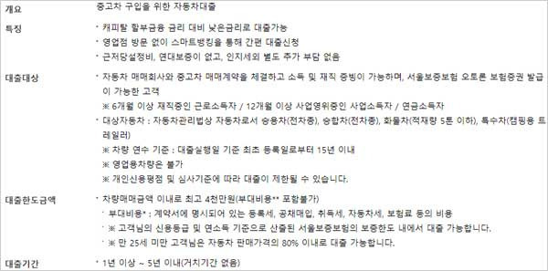 신청 대상 자격 조건은 중고차를 구입하는 분으로서, 자동차 판매회사와 중고차 매매계약을 체결하고, 소득 및 재직 증빙이 가능하며, 서울보증보험 오토론 보험증권 발급이 가능한 분이라고 합니다.