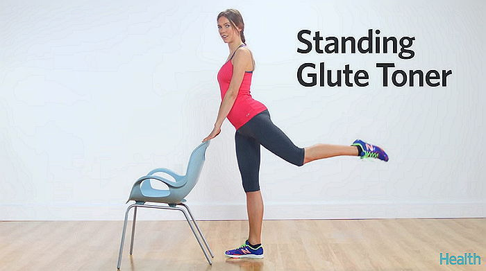 엉덩이 밑살 빼는 운동 중 이 동작은 평평한 곳에 의자를 잡고 선 다음 한 쪽 다리를 120도가량 구부린다. 그 자세에서 천천히 앞뒤와 좌우로 움직인다. 반대편 다리도 반복한다.