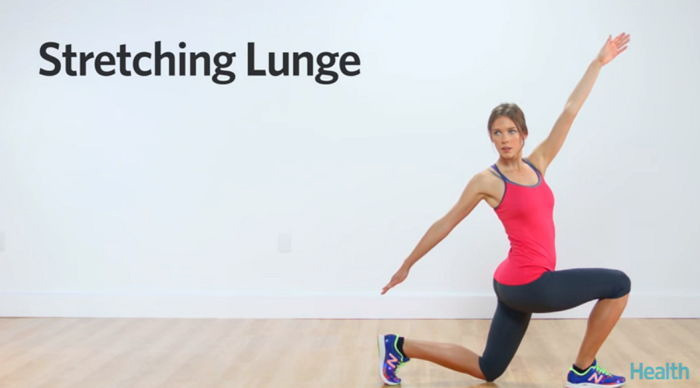 엉덩이 밑살 빼는 운동 중 이 동작은 기본 런지 자세에서 무릎을 조금 더 구부린다. 이어 상체를 살짝 측면으로 틀어 양팔을 쭉 뻗은 자세를 취한다.