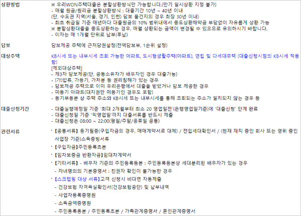 대상주택은 KB시세 조회가 가능한 아파트, 도시형생활주택(아파트), 연립 및다세대주택 (대출신청시점의 KB시세 적용함)이라고 하구요. 담보는 담보제공 주택에 근저당권설정(전액담보부, 1순위 설정)이라고 해요.