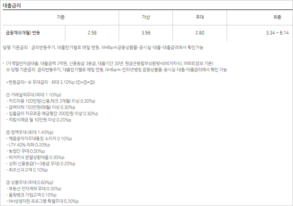 농협 주택담보대출 서류 조건 및 한도, 금리, 중도상환수수료, 상환방법, 대출기간, 신청 대상 자격 조건 등을 포함한 관련내용은 위와 같은데요. 보다 자세한 내용은 상품설명서를 참조하거나, 고객행복센터(1661-3000, 1522-3000) 또는 각 영업점, 농협은행 홈페이지 주택/전세대출 카테고리 내 NH주택담보대출 항목을 통해 확인할 수 있다고 합니다.