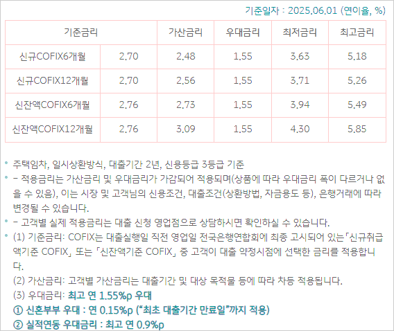 - 대출신청인이 신용도판단정보 등록자(신용회복지원 또는 배드뱅크 포함)이거나 은행의 신용평가 결과 신용등급이 낮은 고객일 경우 대출이 제한될 수 있습니다.