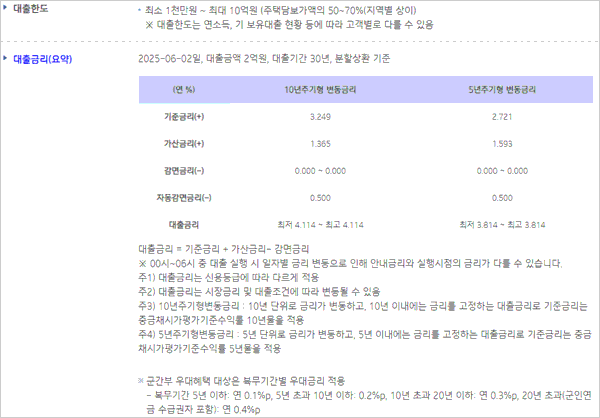 대출 기간은 10년 이상 30년 이내라고 하는데요. 다만 매 5년 단위로 운용된다고 하며, 상환방법은 원금균등분할상환, 원리금균등분할상환 방식이 적용된다고 합니다.