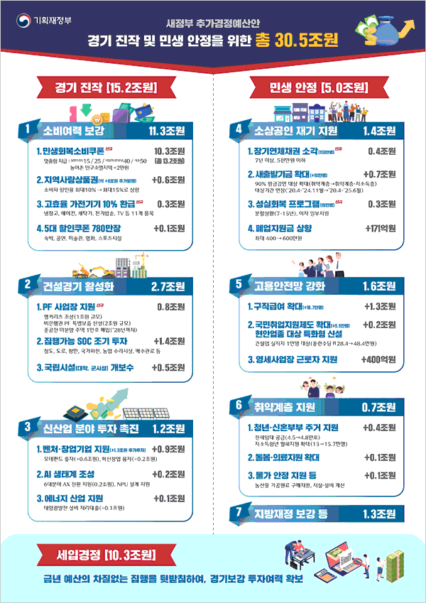 추경 예산안에 따르면 고금리 기간 누적된 채무상환 부담을 덜어주기 위해 1조4000억원의 예산을 투입해 취약차주 143만명을 대상으로 '특별 채무조정 패키지'를 시행할 계획이라고 합니다. 특별 채무조정 패키지에는 △장기연체채권 매입·소각 △새출발기금 확대 △성실회복 프로그램 등이 포함됐다고 합니다.
