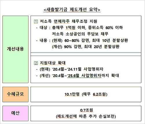 특히 상환능력이 부족한 소상공인의 실재적 재기에 도움을 주려는 목적으로 추경에 반영했다고 하며 기존 새출발기금 이용자들도 이번 제도개선으로 기존 대비 우대된 채무조정을 지원받을 수 있을 경우 재약정을 통해 소급해 적용할 예정이라고 합니다.
