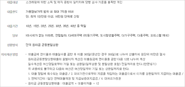 대출 기간 및 상환 방법은 고객님의 계획에 따라 선택할 수 있어요. 기간은 10년, 15년, 20년, 25년, 30년, 35년, 40년 중 택일이구요 전액 원리금 균등분할상환 방식이 적용된다고 해요.
