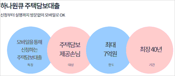 상품 특징을 보면요, 하나원큐 주택담보대출은 인터넷을 통해 아파트 및 주택을 담보로 제공하는 고객님께 편리하게 제공되는 상품이에요. 주택을 새로 구입하거나 기존 대출을 갚을 때, 또는 생활 안정 자금이 필요할 때 등 다양한 용도로 활용할 수 있구요.