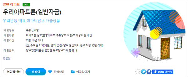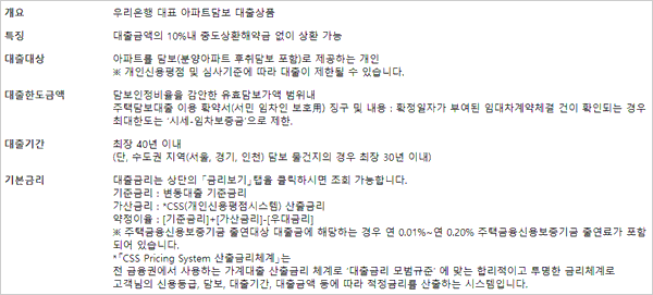 오늘은 우리은행 아파트 담보대출 금리 조건 및 한도 금액, 필요서류, 중도상환수수료, 필요서류, 금리, 이자, 담보, 대출기간, 상환방법, 신청대상 자격 조건 등에 대해 알아보도록 할게요. 우리은행 홈페이지에서 안내하고 있는 우리은행 아파트담보대출 상품은 주택을 담보로 넉넉한 자금을 마련할 수 있는 신뢰도 높은 상품이라고 하는데요.