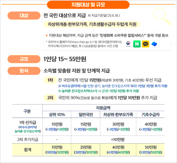 또 서울·인천·경기를 제외한 비수도권 지역 주민에게는 3만원을, 소멸 위기를 겪고 있는 농어촌 인구감소지역 84개 시·군 주민에게는 민생회복지원금 인구소멸지역 소비쿠폰 5만원을 추가 지급하게 되며 최대 45만원을 받을 수 있다고 합니다.