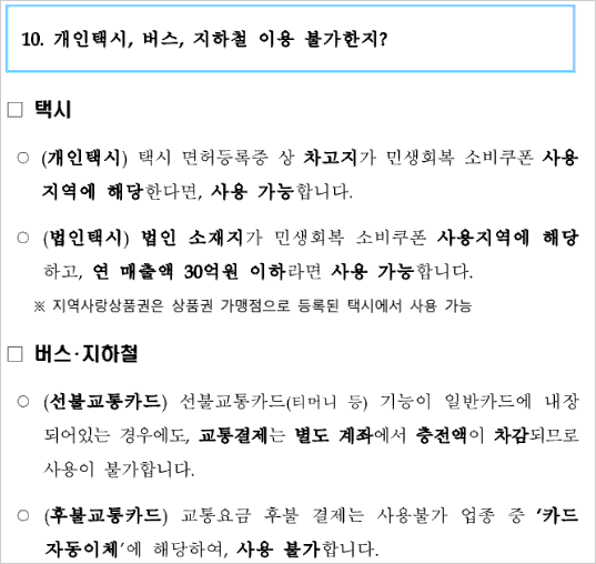 ▶ 택시비, 버스, 지하철 교통비 등 사용 가능 여부