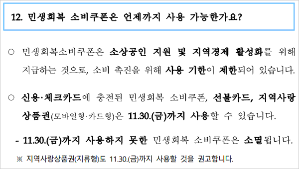 민생회복 지원금 사용 기한은 11월 30일까지인데요. 민생회복 지원금 사용처는 지역 소상공인의 매출 회복과 내수 진작이 목표인 만큼 사용 가능한 업종과 장소가 엄격히 제한된다고 해요.