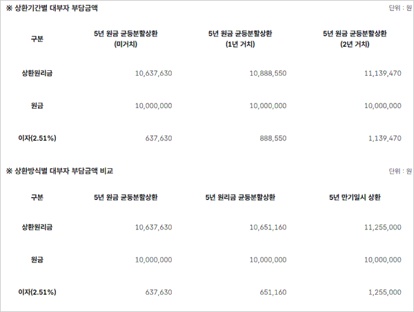 참고로 상환기간별 대부자 부담금액 및 상환방식별 대부자 부담금액은 다음과 같다고 해요.