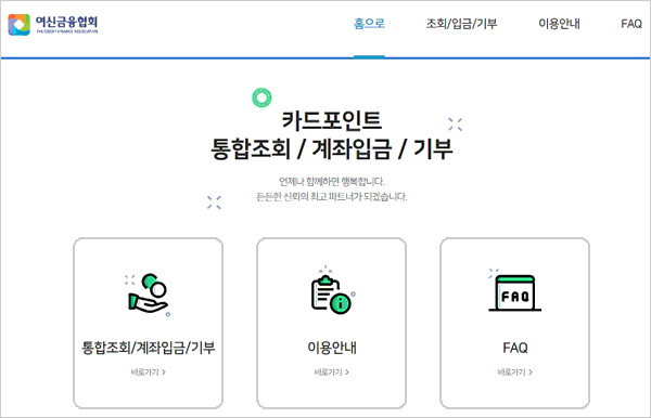 카드포인트 현금화 방법에서 가장 먼저 해야 할 일은 '여신금융협회 카드포인트 통합조회 계좌입금' 공식 웹사이트에 접속하는 것인데요. 포털 사이트 검색창에 해당 이름으로 검색하면 쉽게 사이트를 찾을 수 있다고 해요.