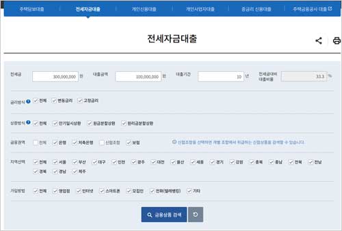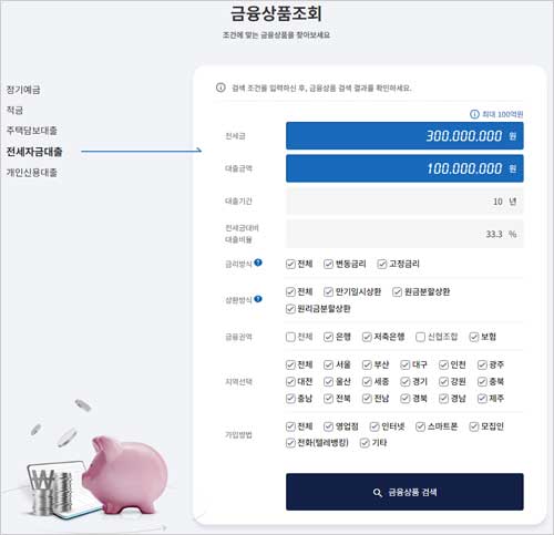 전세자금대출의 종류와 금리 유형을 설정하여 상품군을 필터링합니다.