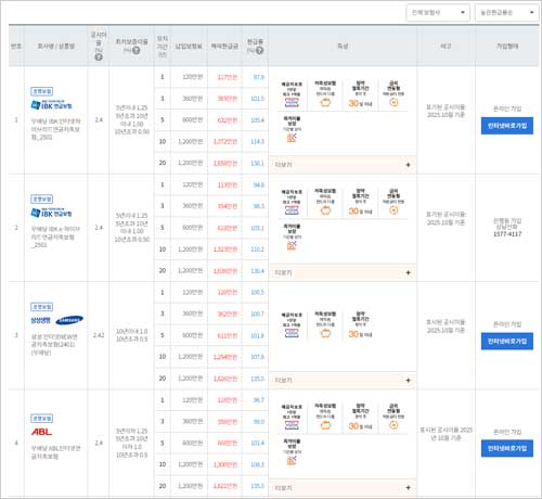 - 조건을 모두 입력하고 '보험료 계산/비교하기' 버튼을 누르면, 참여하는 모든 보험회사의 상품 목록과 함께 소비자가 설정한 조건에 따른 '예상 보험료'가 금리 또는 보험료 순으로 정렬되어 나타납니다.