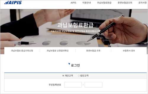 보험개발원이 운영하는 자동차보험 환급금 조회 사이트 '자동차보험 과납보험료 및 휴면보험금 통합조회시스템(AIPIS)은 소중한 자동차보험 자산을 보호하기 위해 개발된 공신력 최고의 서비스입니다. 자동차보험 환급금 조회 사이트는 자동차보험 계약자 및 피해자가 과오납 보험료 및 휴면보험금을 한 곳에서 간편하게 조회 할 있다는 특징이 있습니다.