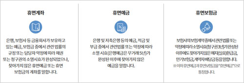 - 보험사: 미수령 보험금, 휴면보험금 (3년 이상 청구하지 않은 보험금)