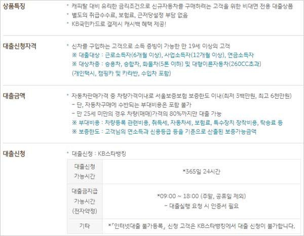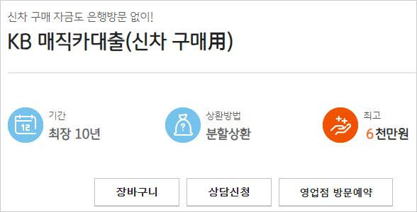 국민은행 자동차대출 오토론 한도 및 금리, 서류, 중도상환수수료, 상환방법, 한도 금액, 대출기간, 신청 대상 자격 조건 등을 포함한보다 자세한 사항은 각 영업점 또는 KB국민은행 고객센터(1588-9999), KB국민은행 홈페이지 자동차대출 카테고리 내 KB 매직카대출(신차 구매用) 항목을 통해 확인할 수 있다고 합니다. 참고하셨으면 좋겠습니다.