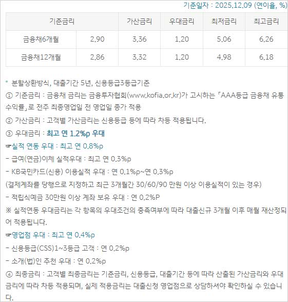 국민은행 자동차대출 오토론 금리, 이자, 이율 및 관련내용은 다음과 같은데요. 국민은행 자동차대출 오토론 금리는 분할상환방식, 대출기간 5년, 신용등급 3등급 기준에 따른 금리라고 해요.