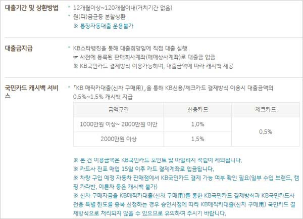 참고로 KB국민카드 결제방식 이용이 가능하구요. KB 매직카대출(신차 구매用)을 통해 KB신용/체크카드 결제방식 이용시 대출금액의 0.5%~1.5% 캐시백이 지급된다고 해요.