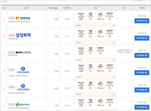 - 보험료 비교 결과 확인: 모든 정보를 입력하고 '보험료 계산하기' 또는 '비교하기' 버튼을 클릭하면, 현재 서비스를 제공하는 모든 보험사(손해보험사)의 여행자보험 상품 리스트가 화면에 제시됩니다.