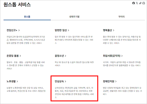 민원24의 안심상속 원스톱 서비스 조회 및 신청은 정부24(gov.kr) 홈페이지에서 민원서비스 항목 아래 원스톱서비스, 안심상속 항목을 클릭하면 안심상속 원스톱 서비스 신청을 할 수 있습니다.