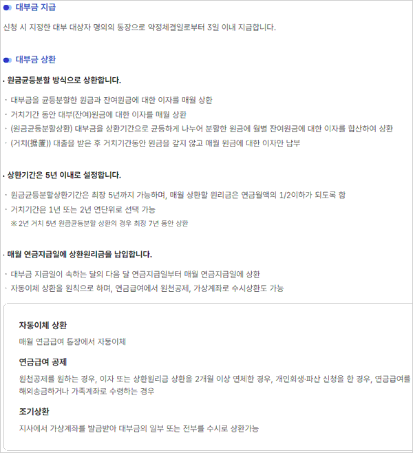 대출 한도는 연금 수령액과 관계없이 최고 1,000만 원이며, 대출 금리는 시중은행보다 낮은 복지적 성격의 금리가 적용된다고 해요. 생활 안정 자금 지원에 초점을 맞추고 있다는 점이 가장 큰 특징이라고 해요.