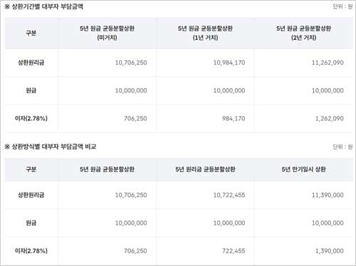 참고로 상환기간별 대부자 부담금액 및 상환방식별 대부자 부담금액은 다음과 같다고 해요.