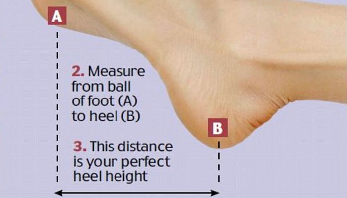 위의 그림에서 A부터 B까지의 거리가 자신에게 맞는 힐의 높이라고 하는데요. 그림을 보고 자신에게 적절한 굽의 높이를 재보시기 바랍니다. 단, 힐이 지나치게 높으면 건강에 악영향을 미치므로 자주 신는 하이힐의 높이는 3인치(약 7.6cm)를 넘지 않는 것이 좋다고 합니다.