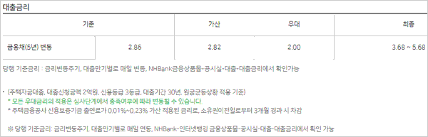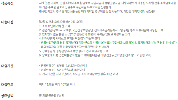 대출기간은 상환 계획에 맞춰 유연하게 선택할 수 있는데요. 금리변동주기가 6개월의 경우 3년초과 최장 40년, 금리변동주기가 5년이면 5년최과 최장 40년 이내까지 장기 대출이 가능하여 월 상환 부담을 줄일 수 있다고 합니다. 반면, 거치기간은 최대 1년이며, 수도권 소재 주택담보인 경우에는 최장 30년 이내라고 하는데요. 상환 방식은 대출 신청 시 고객이 직접 선택할 수 있다고 합니다.