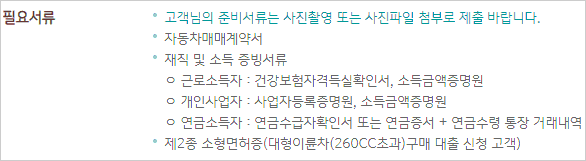 ③ 제2종 소형면허증(대형이륜차(260CC초과)구매 대출 신청 고객) 등이 필요하구요. 국민은행 자동차대출 준비서류는 사진촬영 또는 사진파일 첨부로 제출하면 된다고 해요.