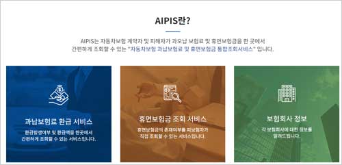 보험개발원이 운영하는 자동차보험 환급금 조회 사이트 '자동차보험 과납보험료 및 휴면보험금 통합조회시스템(AIPIS)은 소중한 자동차보험 자산을 보호하기 위해 개발된 공신력 최고의 서비스입니다. 자동차보험 환급금 조회 사이트는 자동차보험 계약자 및 피해자가 과오납 보험료 및 휴면보험금을 한 곳에서 간편하게 조회 할 있다는 특징이 있습니다.