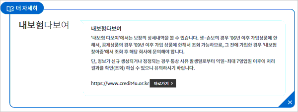 - 약간의 시차 존재: '내보험 다보여' 서비스는 협회를 통해 전산 자료를 받아 오기 때문에, 고객이 최근 며칠 내에 가입하거나 해지한 보험 정보는 즉시 반영되지 않고 약간의 시차를 두고 조회될 수 있습니다.