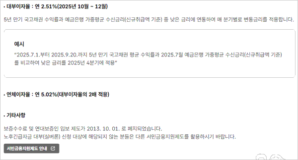 2025.7.1.부터 2025.9.20.까지 5년 만기 국고채권 평균 수익률과 2025년 7월 예금은행 가중평균 수신금리(신규취급액 기준)을 비교하여 낮은 금리를 2025년 4분기에 적용한다고 해요. 참고로 연체 이자율은 연 5.02%로 대부이자율의 2배가 적용된다고 해요.