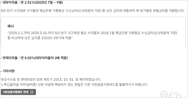 2025.1.1.부터 2025.3.20.까지 5년 만기 국고채권 평균 수익률과 2025년 1월 예금은행 가중평균 수신금리(신규취급액 기준)을 비교하여 낮은 금리를 2025년 2분기에 적용합니다. 참고로 연체 이자율은 연 5.02%로 대부이자율의 2배가 적용됩니다.