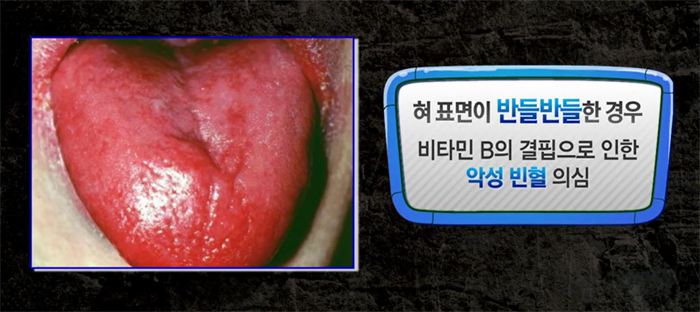 혀에 보면 오돌도돌하게 튀어나온 작은 부분을 설유두라 하는데 이 역시 혈관 조직이라고 합니다. 이 설유두가 없이 맨들맨들하다면 비타민B의 결핍으로 인한 빈혈로 혈관 조직이 위축된 상태인데요. 위장에 문제가 생길 수 있다고 합니다.