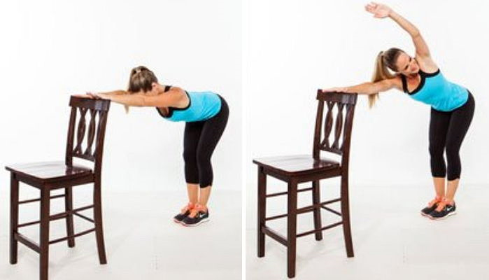 등받이에 손을 올린 후 몸이 직각이 되도록 굽히는데 이때 무릎을 살짝 굽혀주는 것이 더욱 효과적입니다. 이후 수영을 하듯 양 팔을 번갈아가며 회전합니다. 이 의자 운동법은 허리와 복부의 근육을 모두 자극해 주기 때문에 뱃살빼는 운동으로 좋습니다.