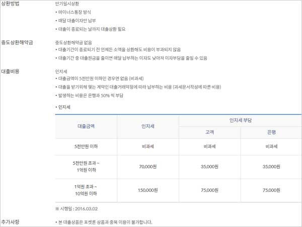 담보는 서울보증보험 전액담보(대출금액의 100%)라고 하구요. 대출관련비용으로서는인지세가 있으며, 은행과 고객이 각 50%씩 부담한다고 하는데요. 다만, 5천만원 이하는 비과세라고 해요.