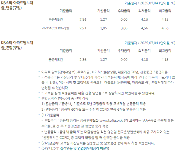 국민은행 아파트 담보대출 금리, 이자 이율은 다음과 같은데요. 아파트 담보(전액유담보), 주택자금, 비거치식분할상환, 대출기간 30년, 신용등급 3등급 기준에 따른 금리라고 해요.
